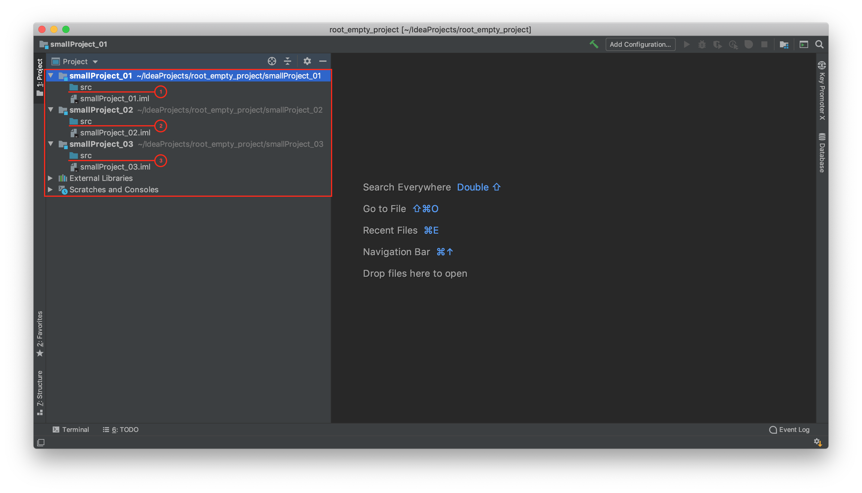 프로젝트 툴 윈도우(Project tool window)에 3개의 모듈이 구성된 걸 확인할 수 있습니다.