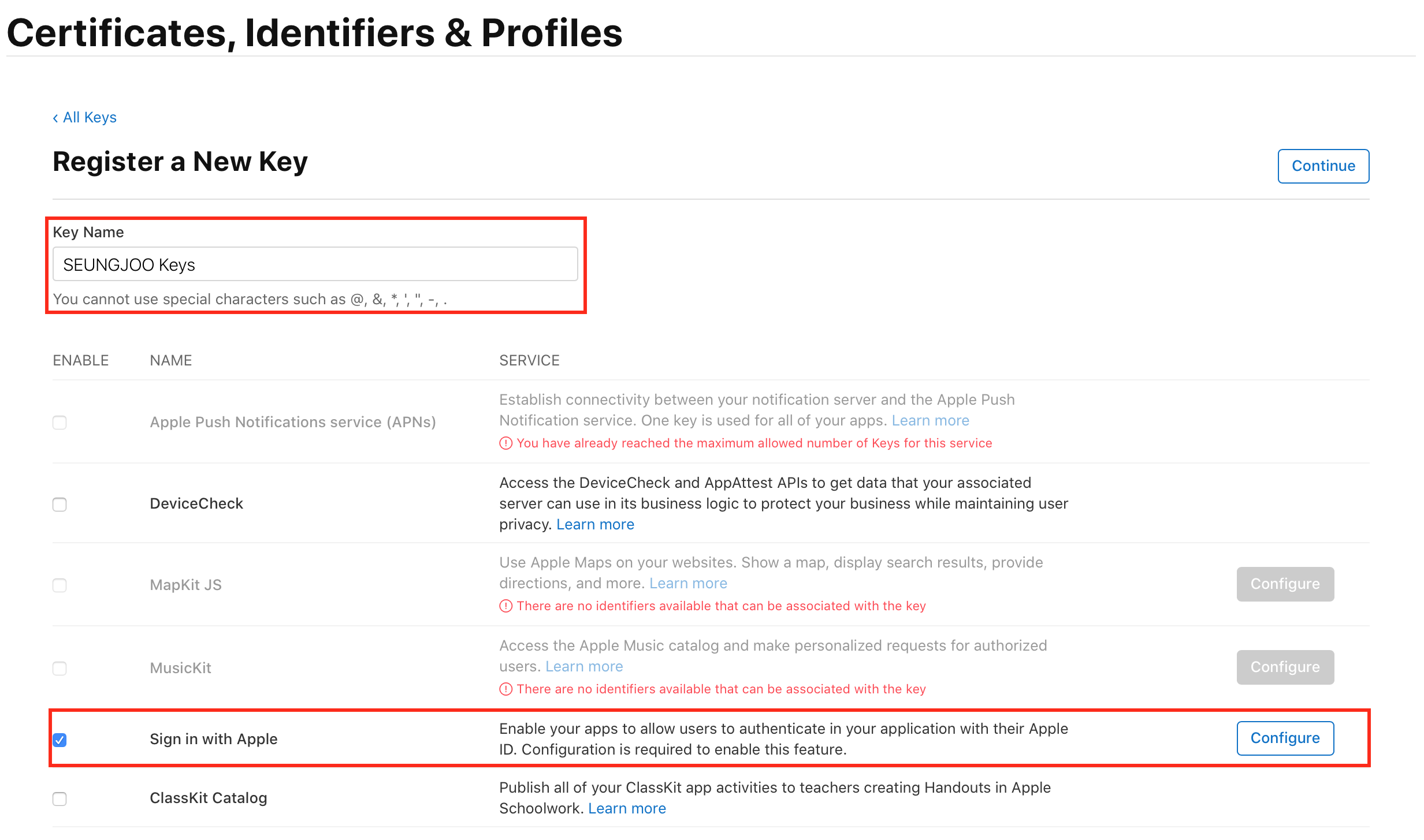 이번에는 애플 로그인(Sign In with Apple)을 진행한 유저의 정보를 전달받기 위한 Services ID를 등록하겠습니다.
