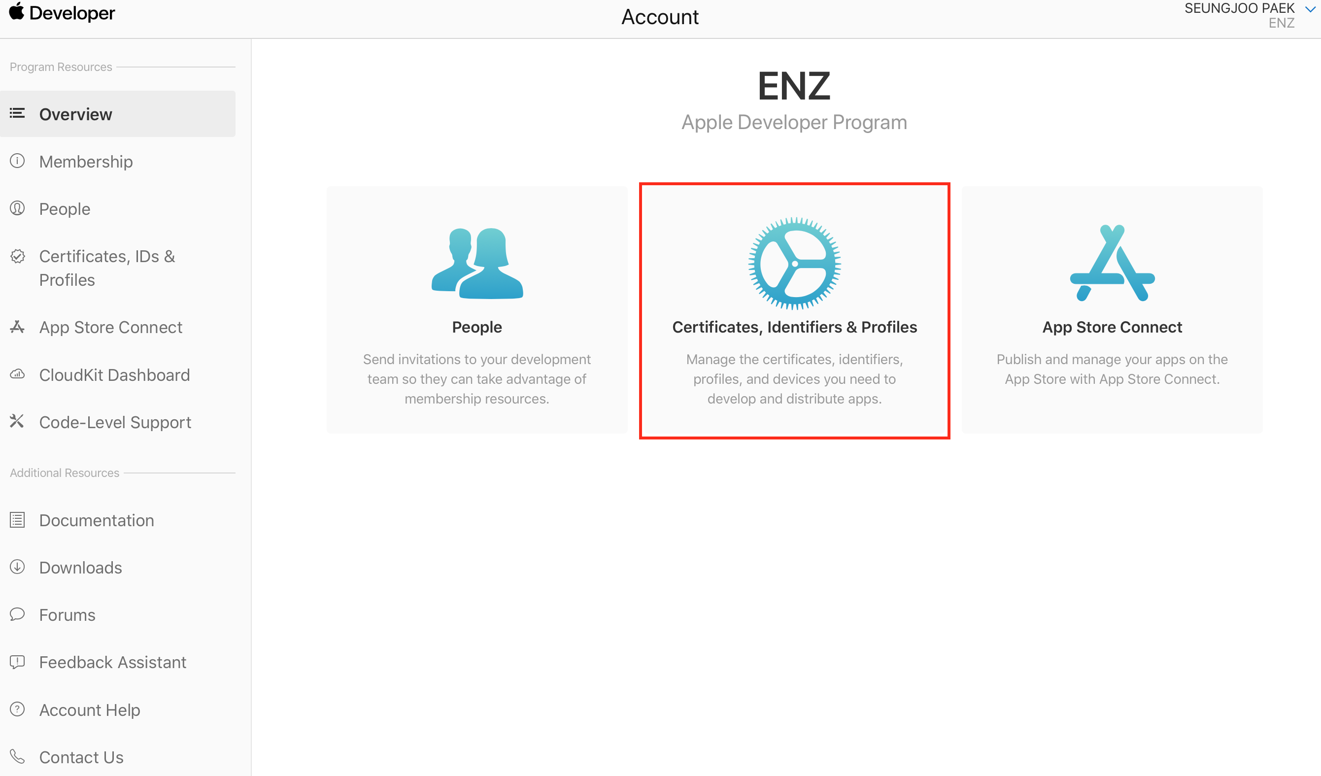 Account - Apple Developer 사이트로 이동 후 "Certificates, Identifiers & Profiles"를 클릭해주세요.