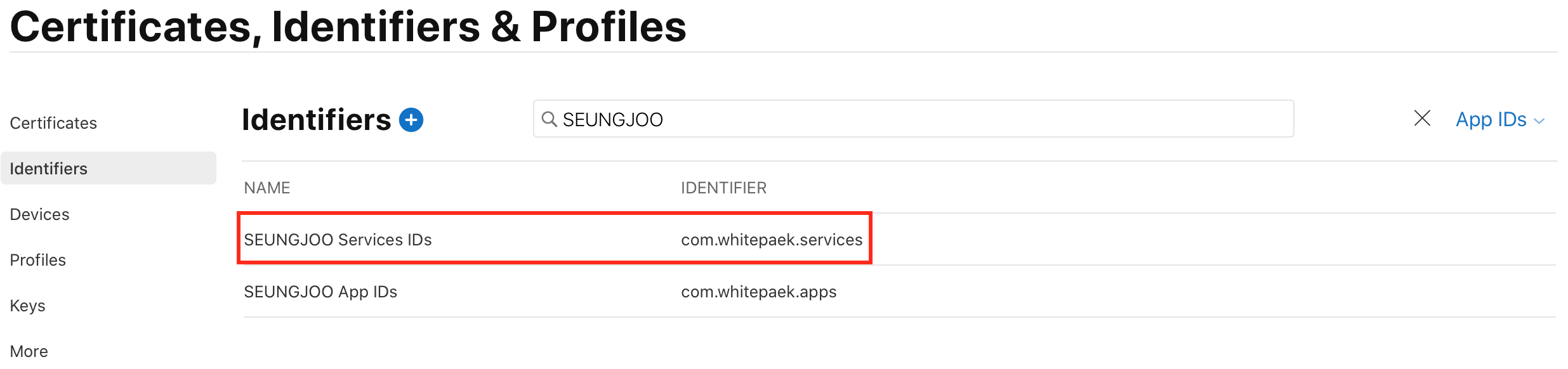 Services ID가 등록되었다면 Identifiers 메뉴 리스트에서