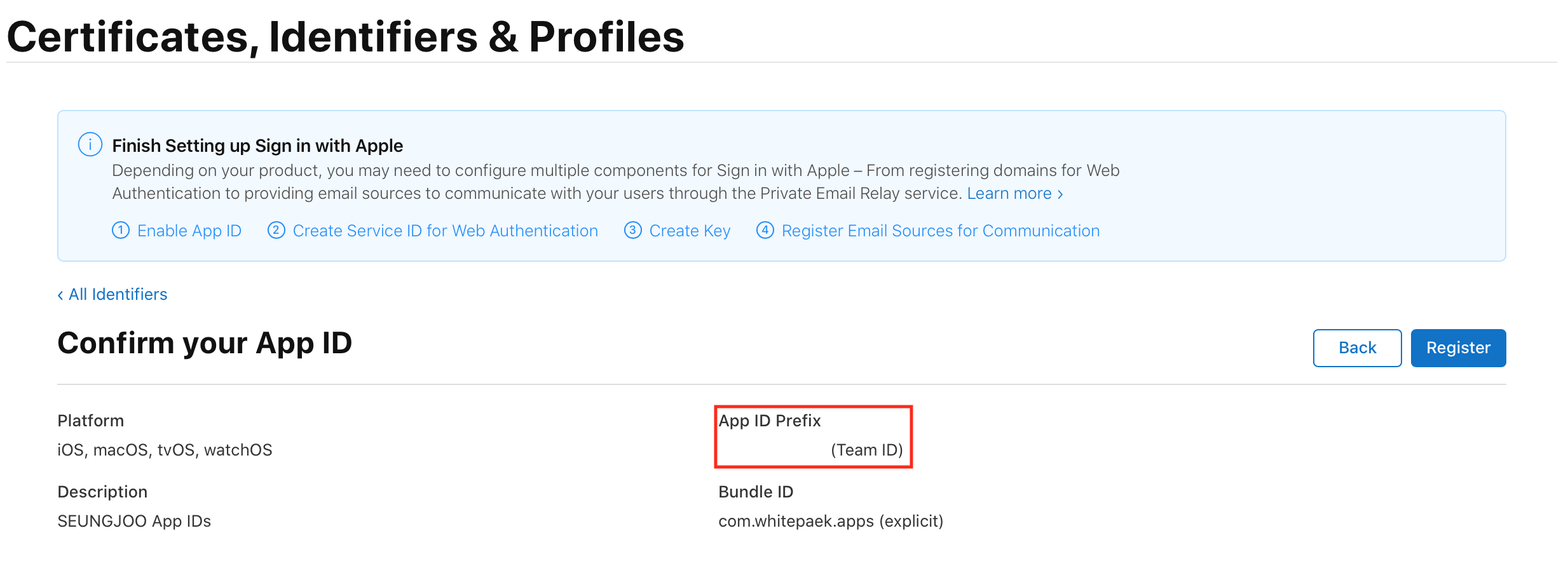 [1] App ID - 자신의 App 서비스를 생성하고, 서비스에 애플 로그인으로 가입한 유저에 대한 이벤트를 전달받기 위한 설정입니다.