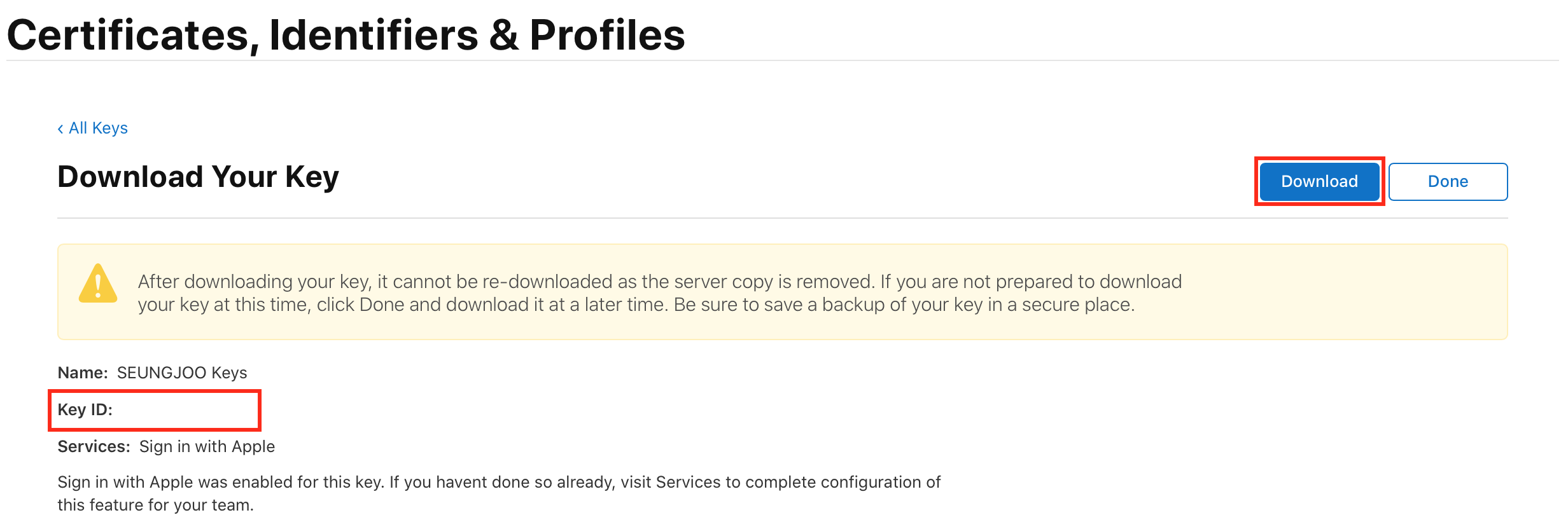 그리고 "Download" 버튼을 클릭하여 Private Key 정보가 들어있는 "AuthKey_[KeyID].p8" 파일을 다운로드하여주세요.