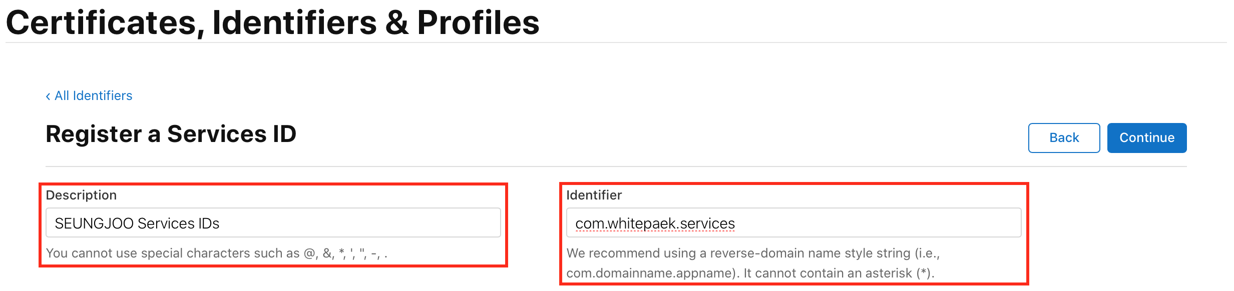"Identifier"에 Services ID를 식별할 수 있는 도메인을 작성해주세요.