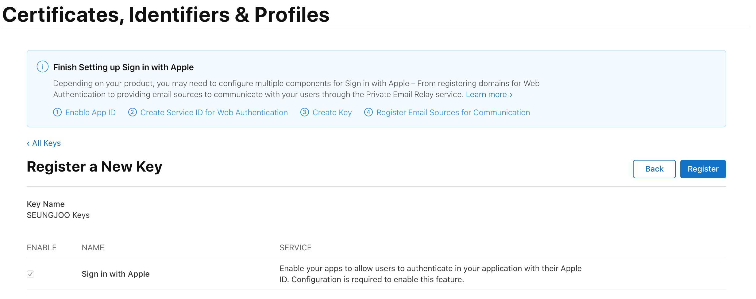 이상으로 애플 로그인 API 연동을 위한 Apple Developer의 3가지 설정을 완료했습니다.